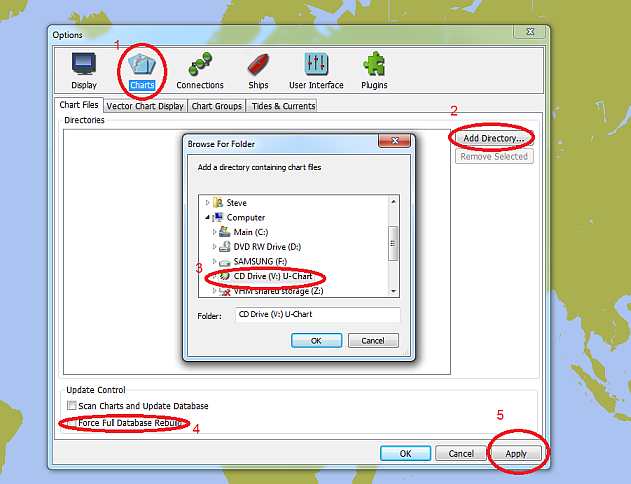 Click "Charts" 1, then "Add Directory" 2, then locate the USB or virtual DVD in Windows tree view and click it 3. Check "Force Full Database Rebuild" 4, then "Apply" 5. OpenCPN will scan and load the charts.