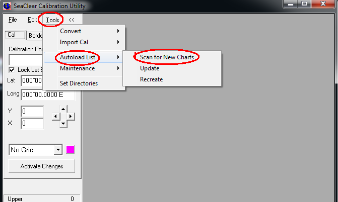 When installed you will have 2 shortcuts on you desktop, one for MapCal and one for SeaClear itself. Unlock the charts as in Step 1. Start MapCal by clicking shortcut. Click Tools >>> Autoload List >>> Scan for New Charts. See below: