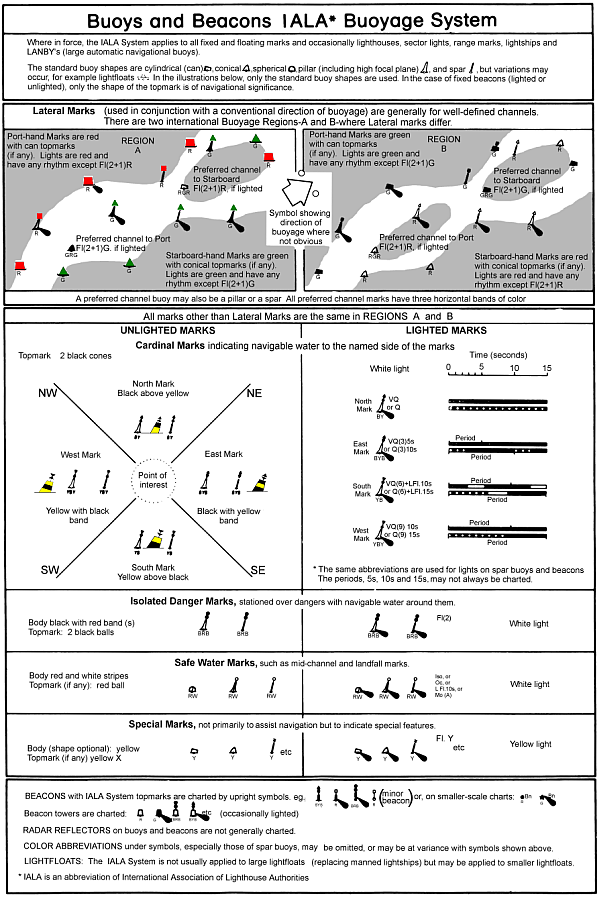 Diagram showing the common types of buoyage, light characteristics, and meanings.