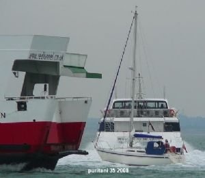 Associated British Ports are in charge of the traffic and safety in the critical precautionary area, and introduced some time ago the notion of a moving exclusion zone in front of and to the side of ships transiting this area. Forget all ideas about power giving way to sail, these monsters are constrained by draft and wouldn't stop for miles even with their engines full astern. We've quoted direct from ABP Southampton in the interests of safety and avoiding any confusion, find the full text in the expandable "More Information" section of this page.
