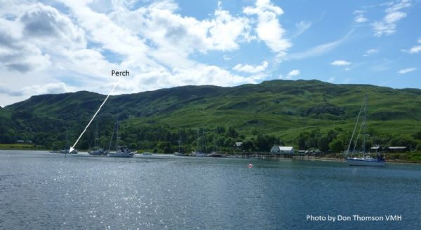 Sailing into Kimelford is confusing; there is a red buoy on the rocks sticking out on the North side of the entrance and a green buoy (replacing the old perch) on the rock off the South shore. The problem is that the green perch is masked by the moorings and they sometimes have a work barge close to it. You need to be careful because, basically, there is a shallow reef from the shore to the rock marked by the perch. The best approach would be to remain outside the moorings (but clear of the red mark on the North shore) and when the pontoon is abeam make towards that through the mooring trots.