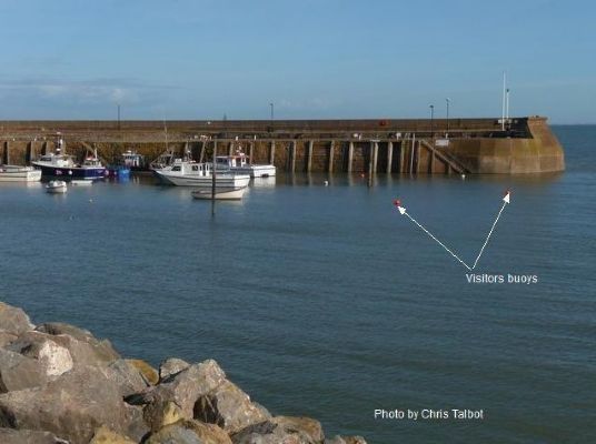 The approach is complicated by that sewage outfall pipe which lies on the bottom to the East of the pierhead. It's not a problem from the West as you can just sail along the coast and once you have passed to seaward of the first red perch you come to you can make directly towards the pierhead taking care not to drift eastwards over the pipe (unfortunately the inward end is not marked so you need to select some lead in marks on the shore whilst also keeping an eye out astern to check your line up)